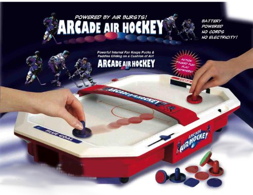 Slide, shoot, score. Table-top game works just like in the arcade - electronic action allows pucks to glide on a cushion of air. Contents: manual scorekeeper, 4 pucks and 4 paddles. For 2 players. Each required 2 D Batteries (not included). For ages 5 and up.