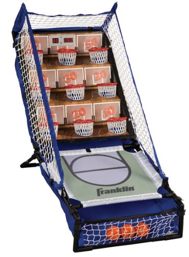 The Electronic Basketball Game from Franklin Sports is an arcade style basketball shooting game with LED scoring and authentic announcer sounds. Features a big bounce trampoline target and net to keep balls in play. Folds easily for travel and storage. Includes 3 mini basketballs . Requires 3 "AAA" batteries, not included. Measures 29.5" x 15.75" x 26.5".